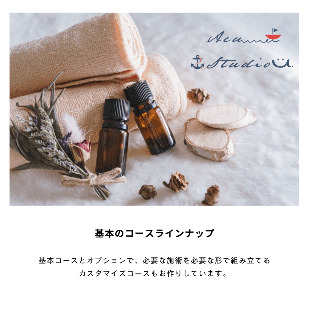 - 初回は事前に送っていただいた「電子カルテ」に基づき、しっかりとお体の状態やお悩みをお伺いします。コースの内容とご料金を説明しました後、完全プライベート空間の施術でゆったりとお過ごしくださいませ。