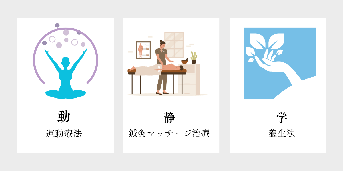 当院では「鍼灸・マッサージ・高周波」を用いた静的で受動的なアプローチに加え、「運動療法・簡単エクササイズ・パーソナルコース」といった動的で積極的な体つくりもサポートしています。