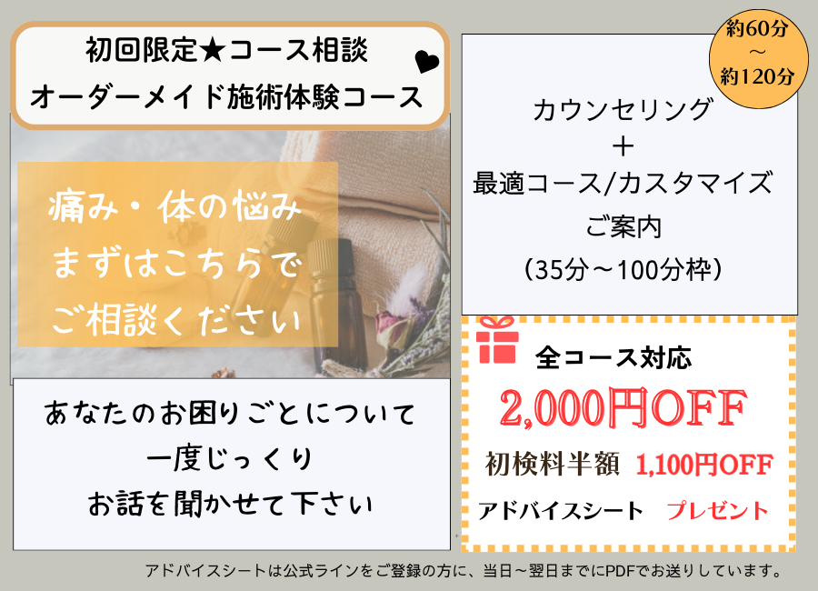 初回は「どんな治療するんだろう」「私に合うかな?」等…不安があるかと思います。少しでも安心してご来院いただけるように、HPをご覧下さった方へ「3タイプの初回体験プラン」をご用意いたしました。
