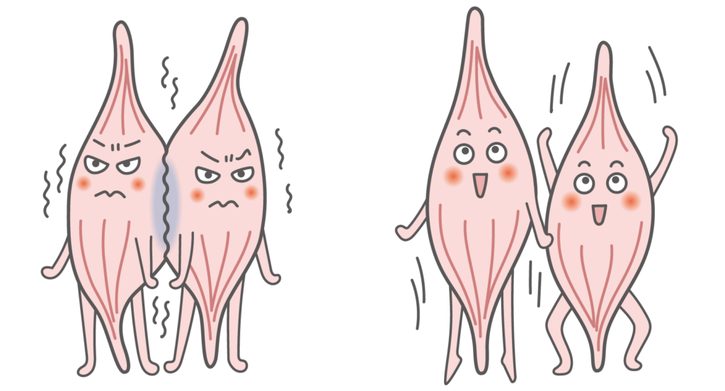 「癒着」とは、本来バラバラに動くはずの筋肉や筋膜が、炎症や血行不良によって「ベタッとくっついてしまった状態」のこと。