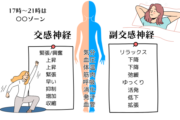 臨床の場に居ると、この状態の方が特に多いのですが、責任感が強く、自分の休息を後回しにする方は、交感神経が優位になりすぎています。