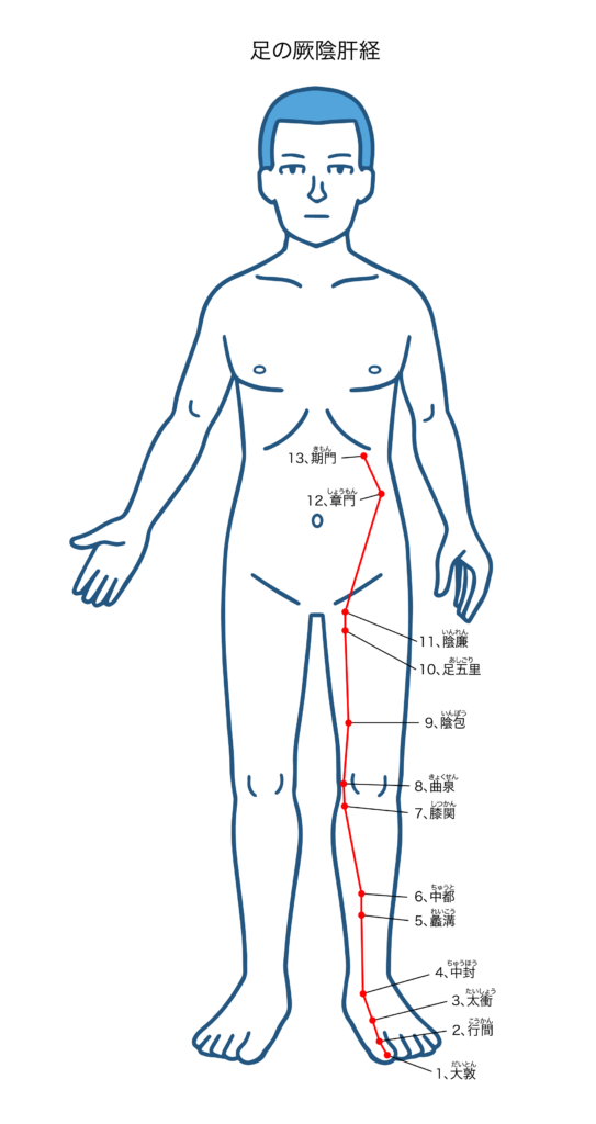 東洋医学では、内ももを通り腹部の子宮や卵巣へとつながる「肝経(かんけい)」や「衝脈(しょうみゃく)」といった経絡(けいらく)が走っています。